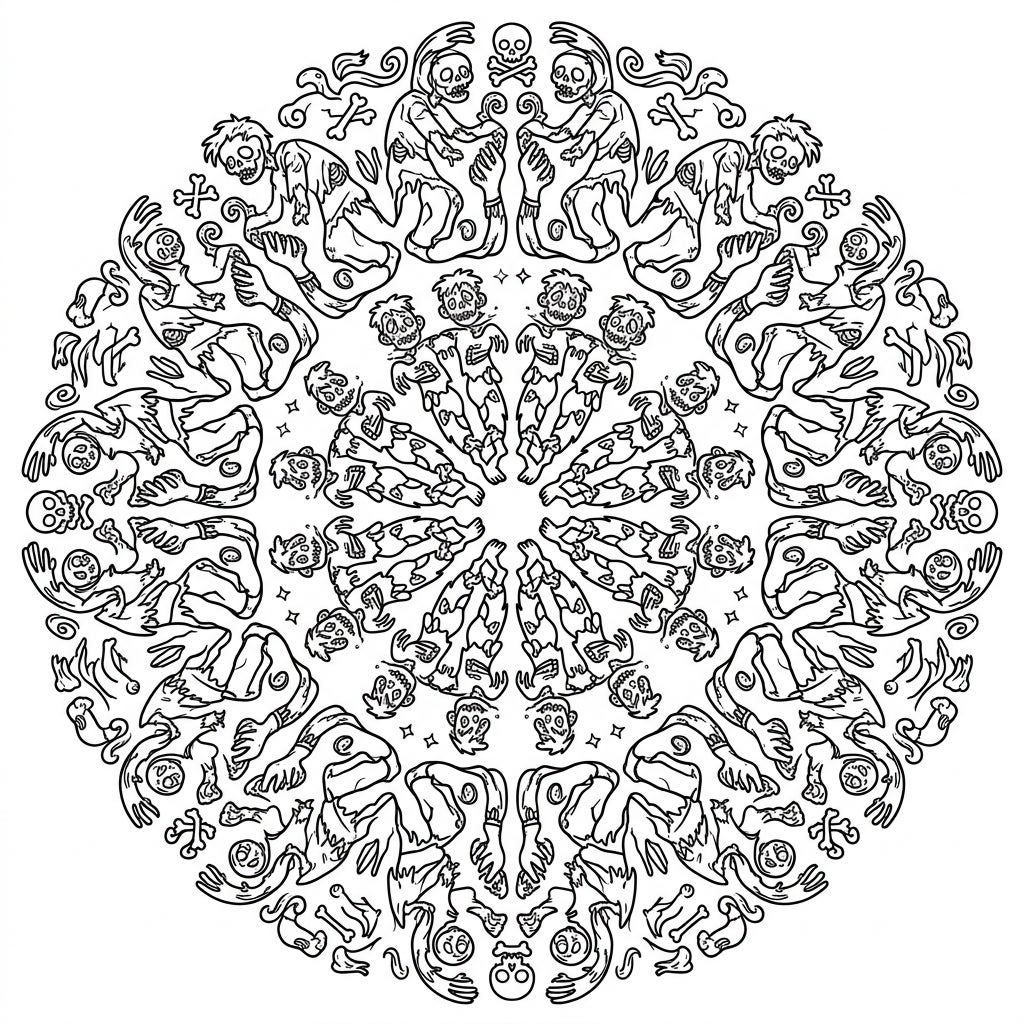 This isn't your average mandala – it's a celebration of the spooky and the symmetrical, perfect for those who love a twist on traditional coloring themes. Whether you're a fan of horror, getting into the Halloween spirit, or simply enjoy designs that challenge the norm, this crawler zombie mandala offers an absorbing artistic experience. The repetitive nature of the mandala combined with the unexpected subject matter creates a strangely calming yet thrilling canvas for your creativity.