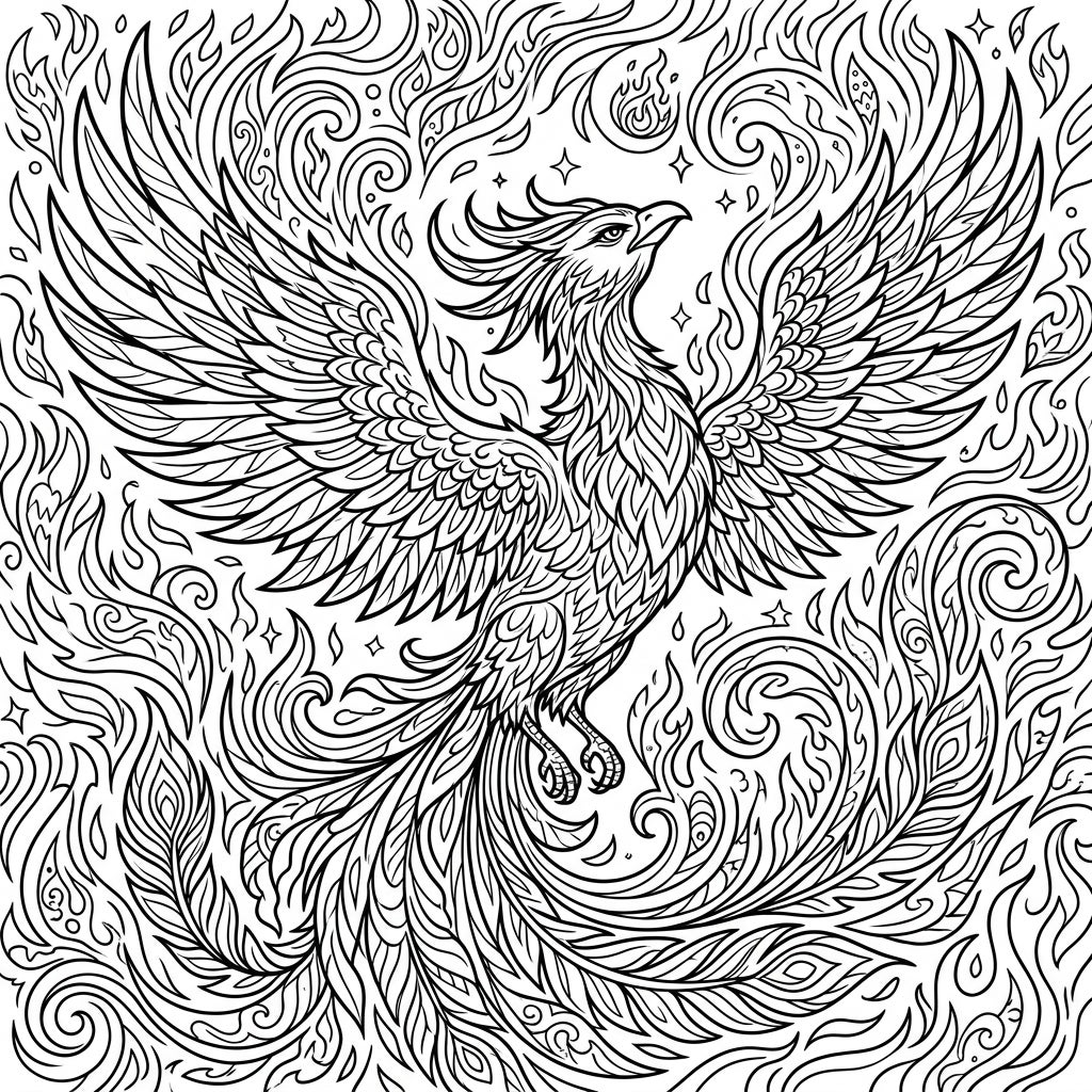Prepare to embark on an epic coloring adventure with this exquisite Crimson Phoenix template. This magnificent creature takes center stage, its grand wings unfurled in a powerful display, each feather meticulously detailed with elegant linear patterns. Its proud head, adorned with a crest, gazes forward, while its long, flowing tail feathers sweep dramatically, blending seamlessly with the fiery background. The entire canvas is a tapestry of intricate lines, depicting dynamic flames and swirling embers, ensuring every corner offers a rich and rewarding coloring challenge.