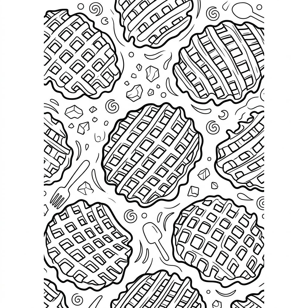 Unleash your inner artist with this delightful coloring page showcasing a dynamic pattern of crispy waffle fries! Each intricately detailed fry, with its signature lattice-cut design and substantial surface area, is ready to be brought to life. Scattered throughout the composition, you'll find charming culinary accents like tiny forks, spoons, and playful swirls, adding depth and whimsy to this appetizing scene.
