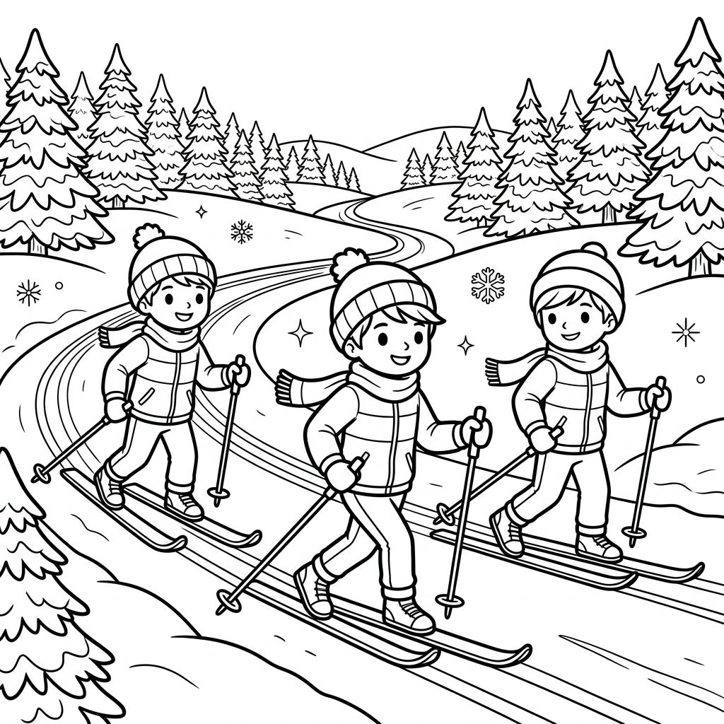 Get ready for a frosty adventure with this delightful cross-country skiing coloring page designed especially for kids. Watch as three cheerful children glide through a beautiful winter wonderland, perfect for bringing vibrant colors to life.