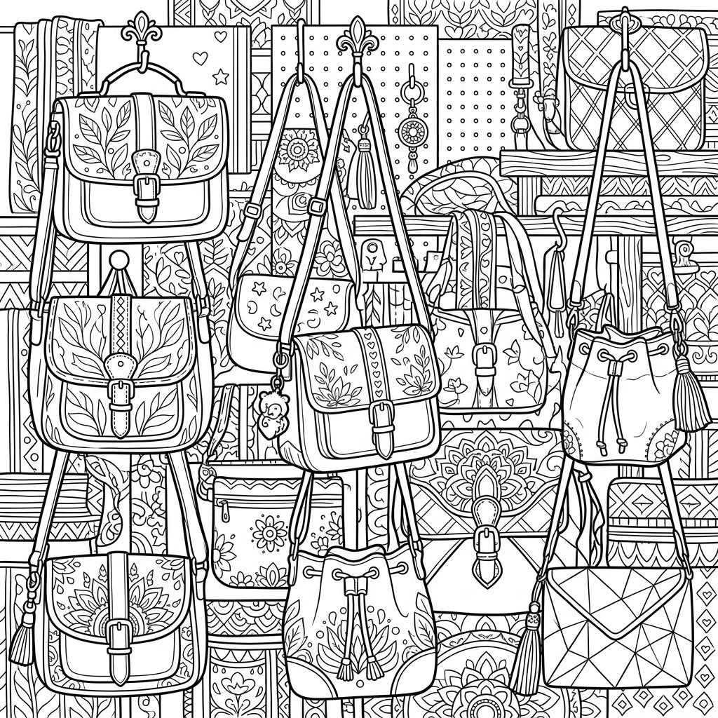 Discover a fashionista's dream with this intricate coloring page featuring a full scene of stylish crossbody bags. Each bag boasts unique patterns and details, promising hours of creative expression.