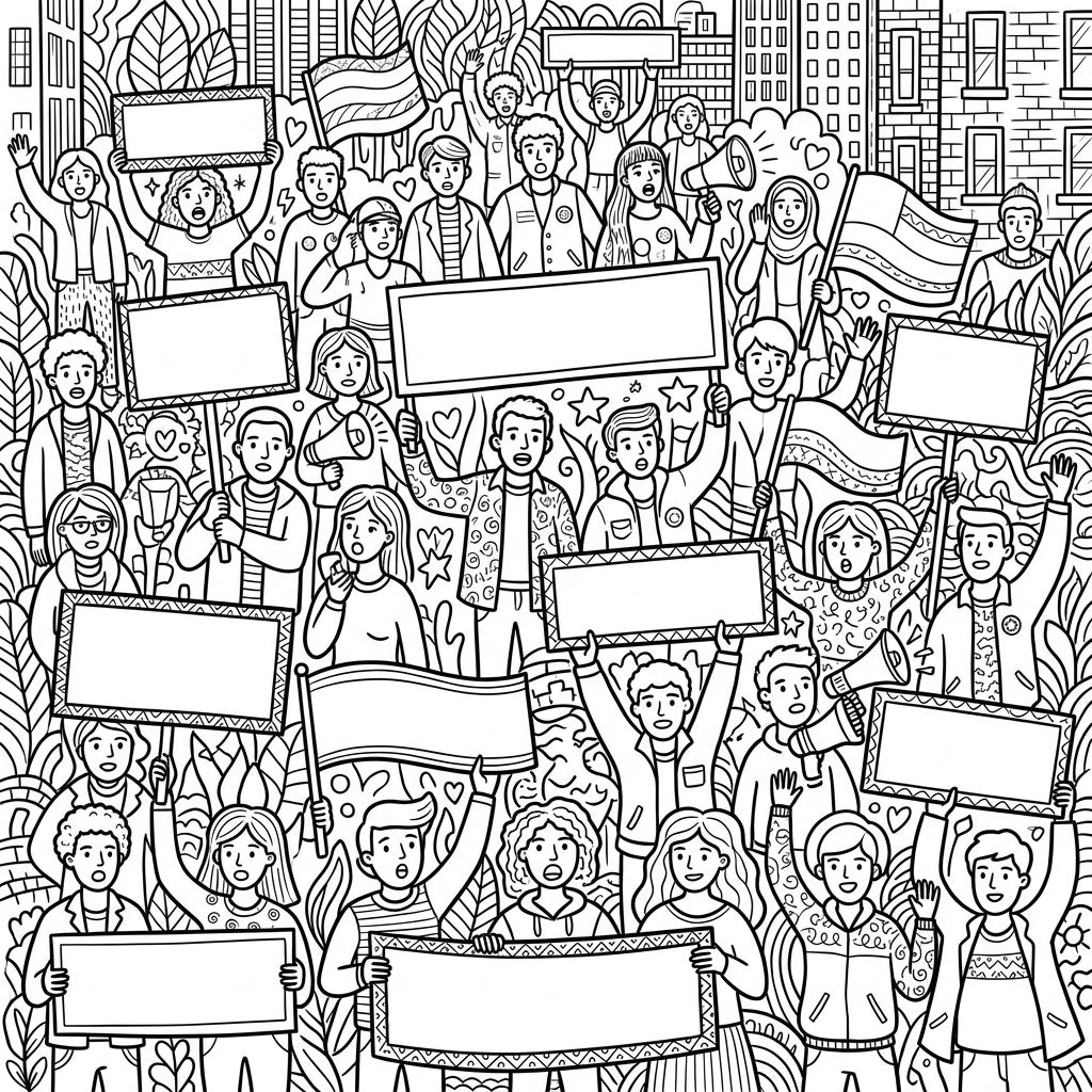 Step into a world of collective action and vibrant community with this highly detailed adult coloring page. This intricate design captures a bustling scene of people gathered together, each figure contributing to a powerful tableau of unity and expression. From individuals holding blank signs ready for your personal messages to subtle background details of urban landscapes and foliage, every element invites a meticulous and thoughtful coloring experience.