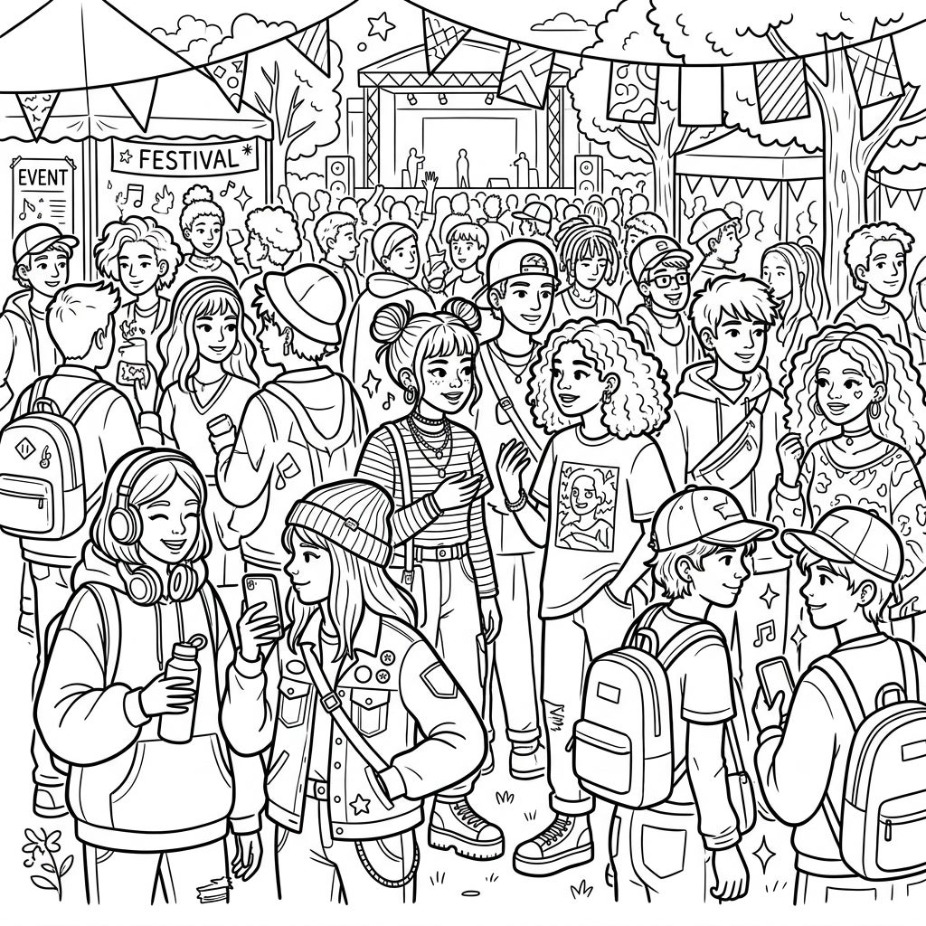 Capture the vibrant atmosphere of a youth music festival with this exciting coloring page. Explore a detailed scene brimming with trendy teens enjoying a live concert under festive banners.