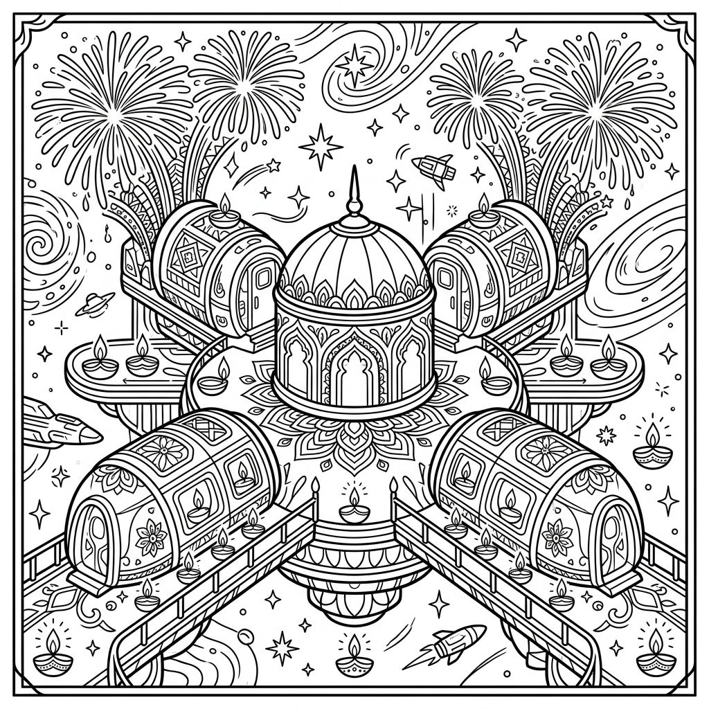 Step into a breathtaking vision where the future meets tradition on this captivating coloring page. You'll discover a complex cryosleep colony, featuring a grand central dome surrounded by four cylindrical habitat modules. Each structure is meticulously decorated with elaborate patterns reminiscent of traditional rangoli, connected by elegant pathways lit by numerous diyas. The meticulous line art and symmetrical design invite you to explore every detail, from the futuristic architecture to the festive adornments.