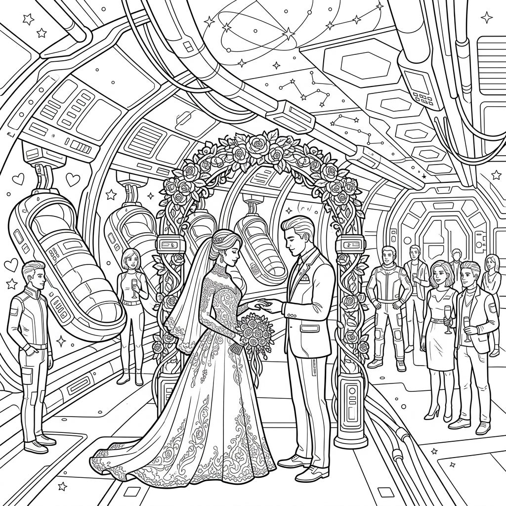 Step into a breathtaking fusion of past and future with this 'Wedding in a Cryosleep Colony' coloring page. Witness a beautiful bride in an exquisitely detailed gown and a dashing groom exchanging vows under an ornate floral arch, all set within the sleek, metallic confines of a futuristic space station. Surrounding them are sophisticated guests, some in classic wedding attire, others sporting chic futuristic jumpsuits, as cryosleep pods hum softly in the background, hinting at journeys yet to come.