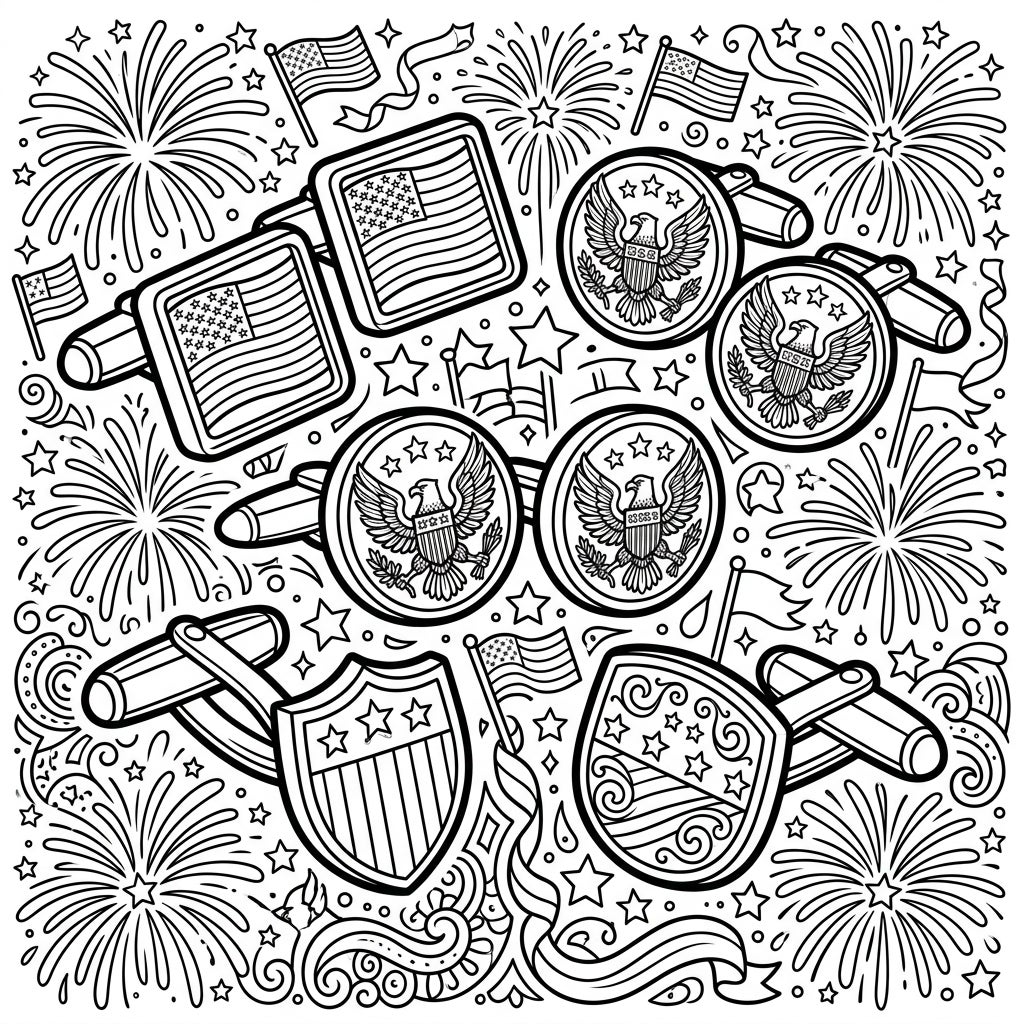 Dive into the intricate details of this special Independence Day coloring page, showcasing a variety of patriotic cufflinks. Discover square cufflinks emblazoned with the stars and stripes of the American flag, alongside elegant round cufflinks featuring majestic bald eagles, a symbol of freedom. You'll also find shield-shaped cufflinks with both stars and stripes, all artfully arranged amidst a festive backdrop of bursting fireworks, waving miniature flags, and a shower of scattered stars and festive ribbons, providing a rich tapestry of details to bring to life with color.