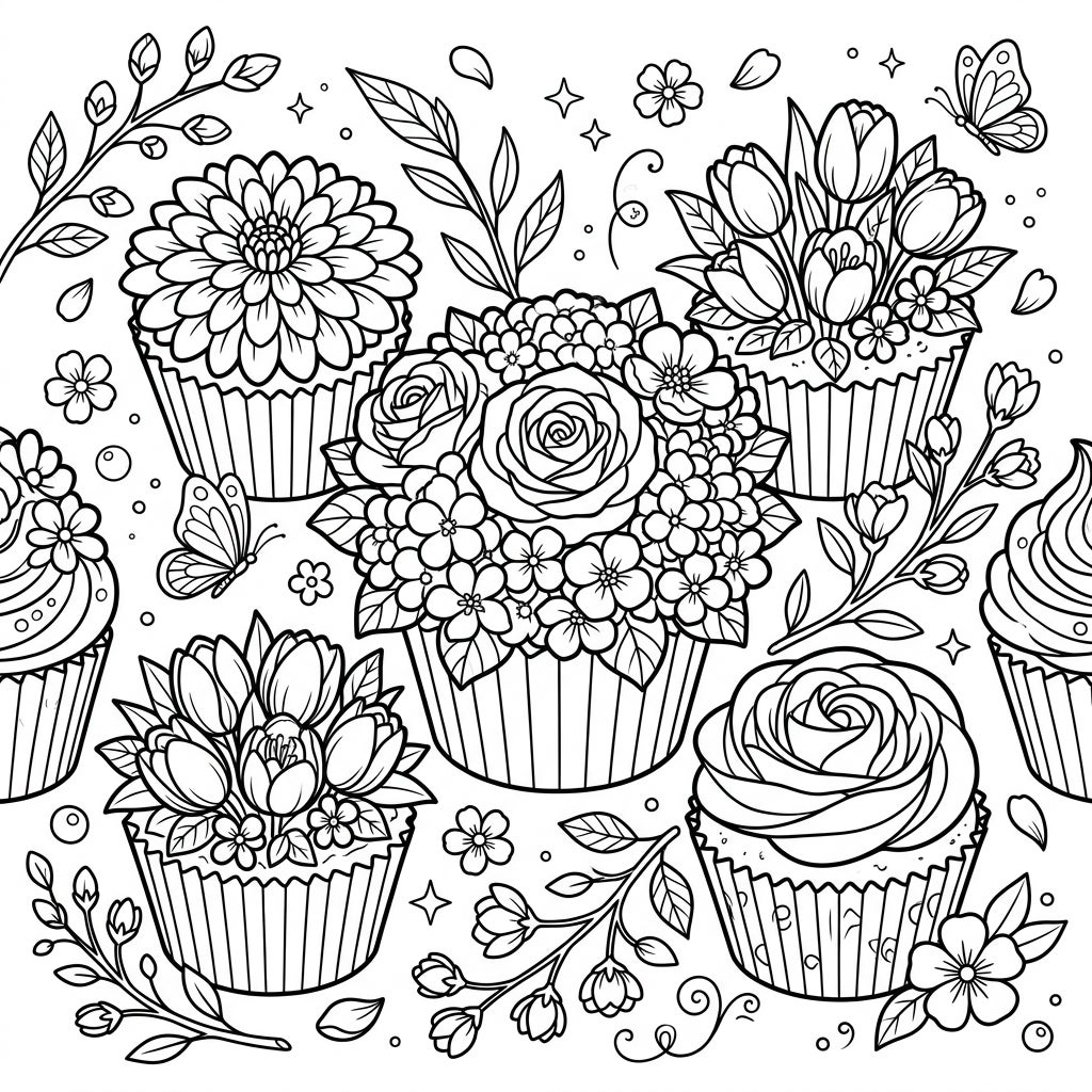 Dive into a world where delicious treats meet beautiful blooms with this exquisite coloring page featuring spring cupcake bouquets. Each cupcake is a masterpiece, adorned with a variety of meticulously detailed flowers, including elegant roses, cheerful tulips, lush hydrangeas, and a large dahlia-like blossom, all nestled in delicate cupcake liners. The arrangement creates a visual feast, celebrating the artistry of dessert decoration.