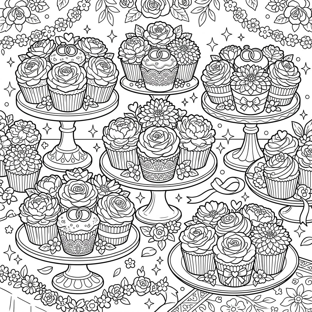 Beyond the delicious treats, this coloring template truly captures the essence of a wedding celebration. Discover charming details like tiny intertwined wedding rings atop some cupcakes, subtle lace patterns adorning their wrappers, and sparkling accents scattered throughout the composition, hinting at a day filled with joy and love. It’s an invitation to partake in the festive atmosphere, imagining the happy couple and the sweet memories being made.