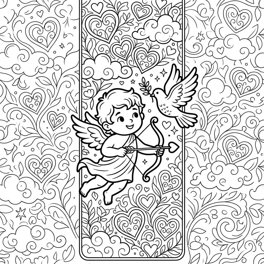 Embark on a delightful coloring journey with this charming bookmark featuring Cupid, the god of love, accompanied by a peaceful dove. This intricate design is perfect for creating a personalized marker for your favorite romantic tales or heartfelt gifts.