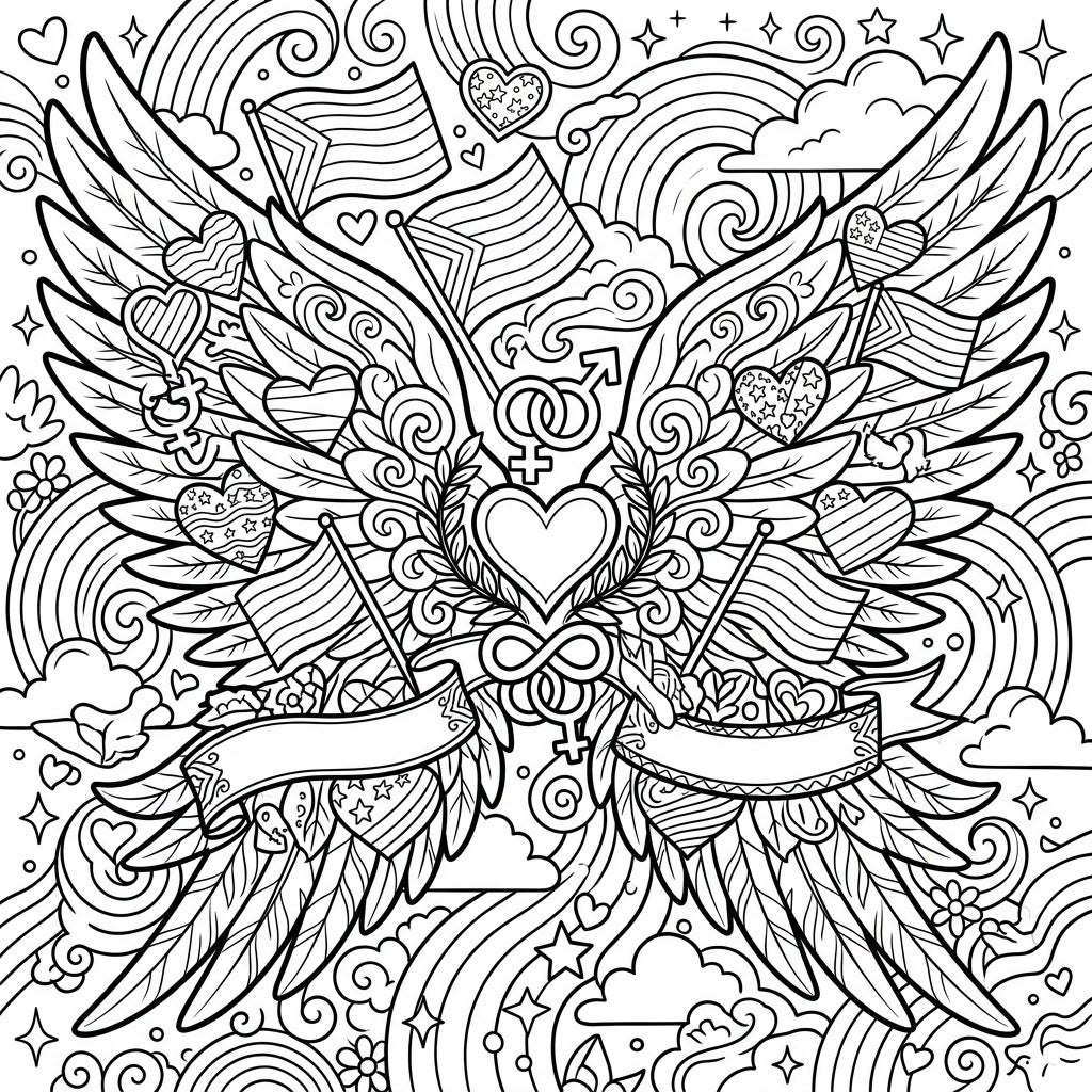 Dive into a world of love and acceptance with this captivating coloring page, where the ethereal beauty of Cupid's wings intertwines gracefully with the vibrant spirit of Pride Month. This intricate design features a magnificent pair of feathered wings, a powerful symbol of swift movement and divine connection, spreading across the entire canvas. At its heart, a laurel-wreathed emblem surrounds a central heart, flanked by the infinity symbol and intertwined gender symbols, signifying endless love and unity. The surrounding composition is a joyful tapestry of diverse hearts, some adorned with stars and stripes, alongside celebratory Pride flags that flutter amidst swirling rainbows, fluffy clouds, and twinkling stars, inviting your artistic touch.