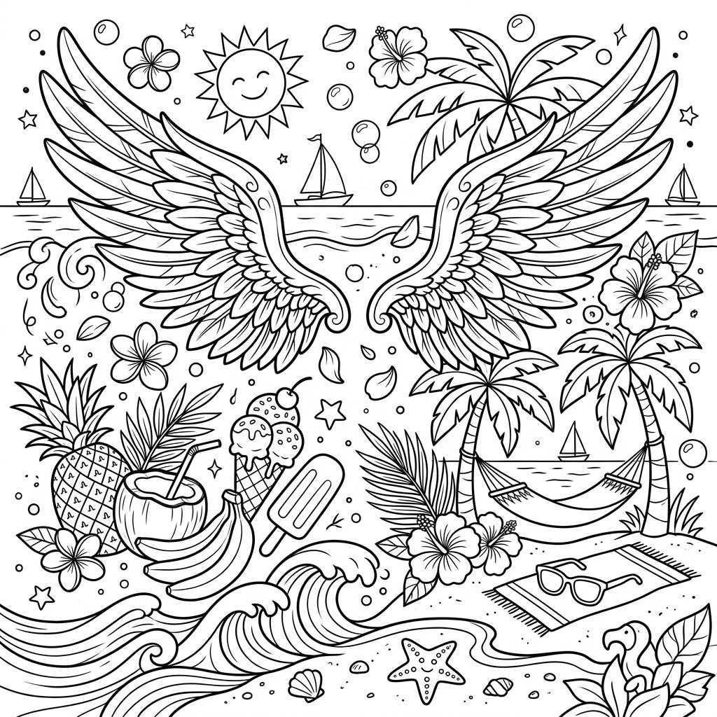 Unleash your creativity with this delightful summer-themed coloring page, featuring elegant Cupid's wings soaring over a vibrant beach landscape. Discover an array of sunny elements, from palm trees and waves to delicious tropical treats, all waiting for your artistic touch.