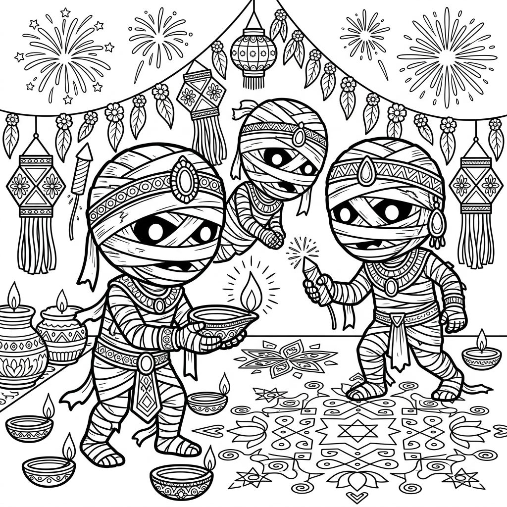 Dive into a wonderfully whimsical world where ancient mummies celebrate the vibrant festival of Diwali. This unique coloring page blends spooky fun with festive lights, intricate patterns, and dazzling fireworks, perfect for an exciting artistic adventure.