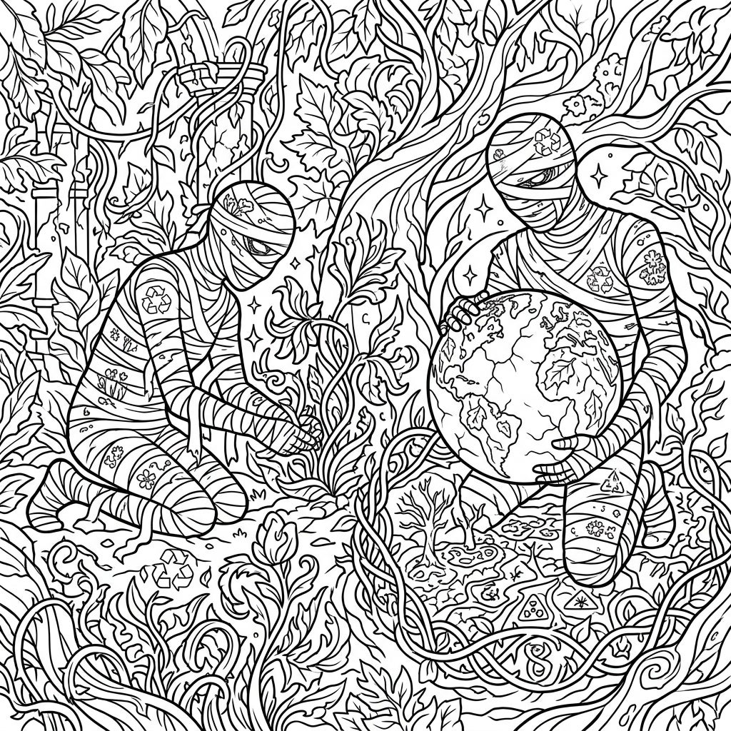 Embark on an epic coloring journey with our 'Cursed Mummies x Earth Day' template, where the mystique of ancient guardians meets a vital environmental message. This captivating design features two enigmatic mummies, their bandages adorned with recycling symbols, deeply engrossed in protecting our planet. One mummy meticulously tends to new growth, planting a sapling amidst sprawling vines and detailed foliage, symbolizing renewal. The other cradles a fragile Earth globe, its continents etched with care, representing a commitment to global preservation against a backdrop of both natural beauty and subtle signs of past neglect.