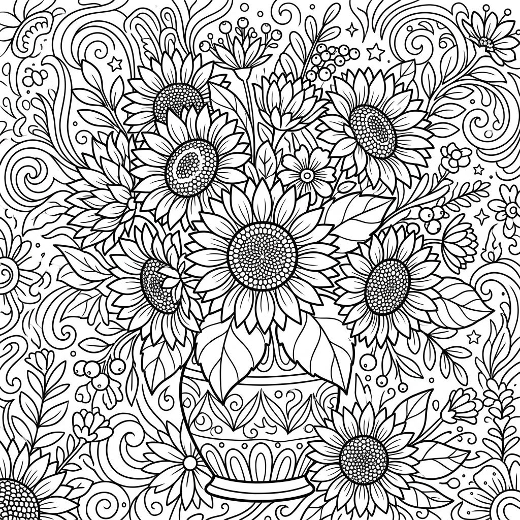 This exquisite coloring template presents a lavish bouquet of freshly cut sunflowers, meticulously arranged in an elegantly patterned vase. The composition is rich with visual interest, featuring numerous sunflower heads, each with detailed seed centers and radiating petals, interspersed with delicate leaves, small berries, and other complementary floral elements. The background is a tapestry of enchanting swirls, stars, and smaller blossoms, ensuring every inch of the page offers an opportunity for artistic exploration and vibrant color application.