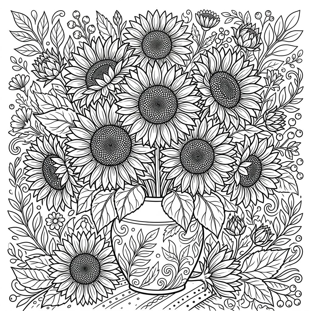 Dive into the intricate beauty of this cut sunflowers coloring page, a true celebration of nature's golden blossoms. This full-page illustration showcases a magnificent bouquet of sunflowers, each head brimming with delicate details, from their prominent centers to their radiating petals. They are artfully arranged in a decorative vase, adorned with elegant floral patterns that add an extra touch of charm to the composition. Surrounding the main arrangement, you'll discover a rich tapestry of leaves, small berries, and complementary floral elements, creating a lush and immersive scene ready for your artistic touch.