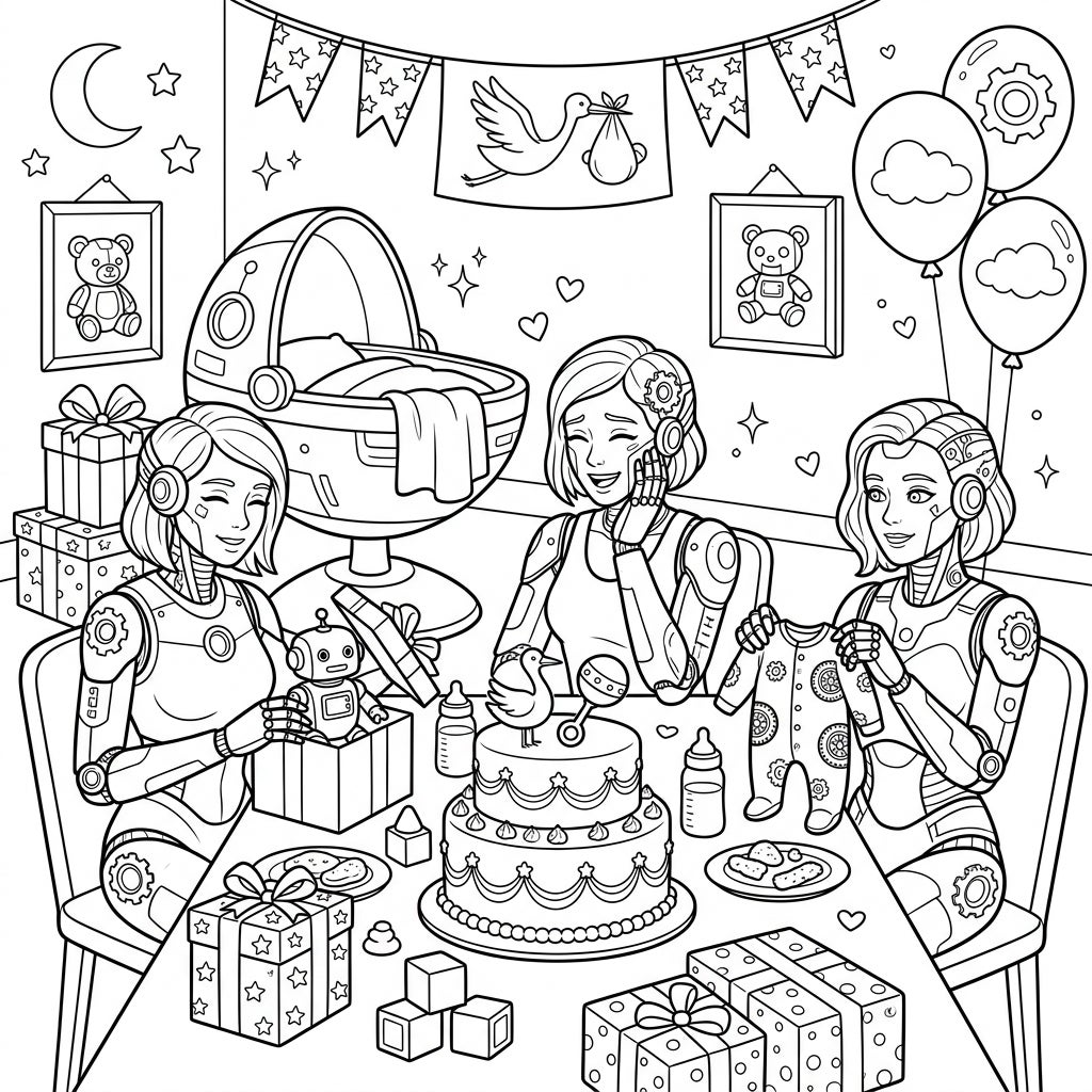 Prepare for a truly one-of-a-kind coloring experience with this intricate Cyborg Baby Shower scene. Our detailed illustration showcases three delightful cyborg friends, their metallic parts gleaming with potential for vibrant colors, as they celebrate an upcoming arrival. Observe the festive table laden with a grand multi-tiered cake, tiny baby bottles, and beautifully wrapped gifts, including one holding an adorable little robot toy. The futuristic bassinet stands ready, awaiting its precious cargo, all set against a backdrop of whimsical baby shower decorations.