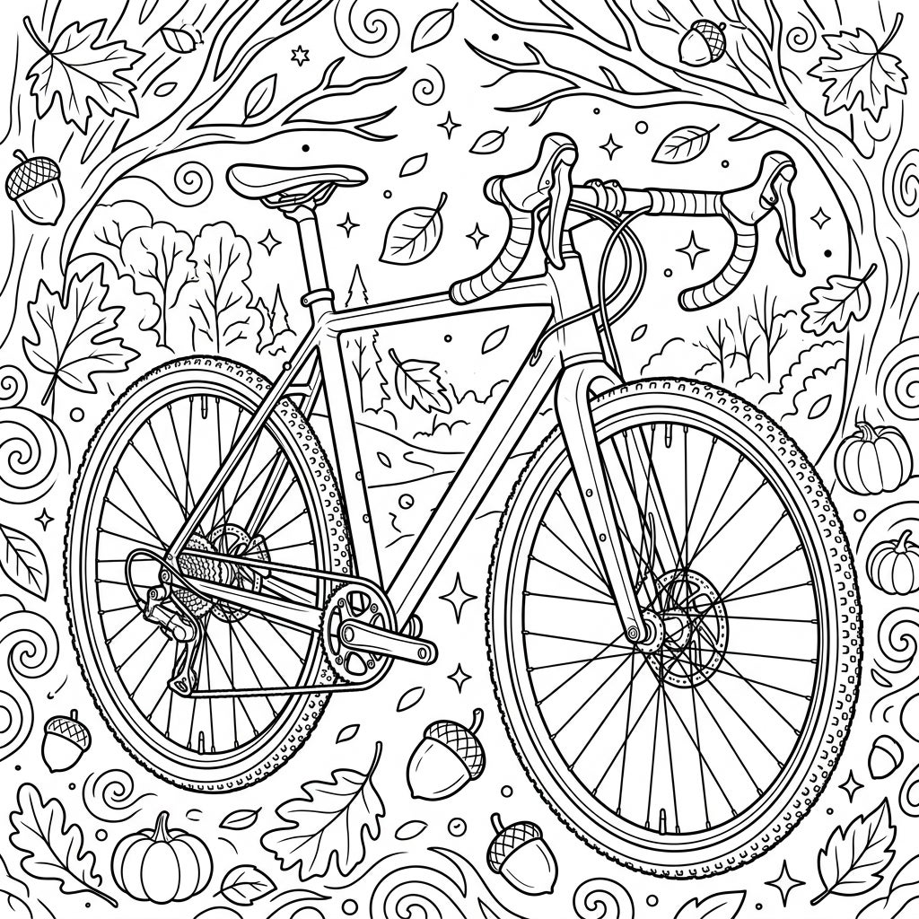 Embark on a creative journey with this intricately designed coloring page featuring a cyclocross bike set against a rich autumn backdrop. Every detail of the robust bike, from its specialized frame and knobby tires to its precise braking system, is rendered with care, inviting you to bring its dynamic form to life. Surrounding the bike, you'll discover a lavish spread of classic fall elements including gracefully falling leaves, plump harvest-themed pumpkins, and scattered acorns, all nestled within a whimsical woodland pattern.