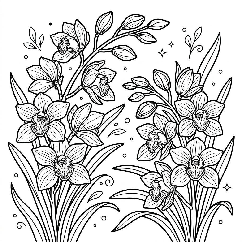 Dive into the beauty of nature with this enchanting Cymbidium Orchids coloring page, designed especially for kids. Featuring elegant blooms and lush leaves, it promises hours of creative fun.