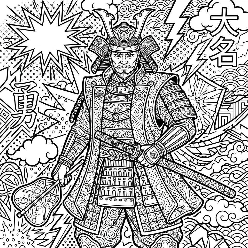Unleash your inner artist by experimenting with vibrant, contrasting colors to truly capture the essence of Pop Art, or opt for more subtle hues to highlight the historical gravity of the Daimyo. Whether you choose bright neons for the comic elements or rich, earthy tones for the samurai's attire, this template invites endless possibilities for personal interpretation. Dive into the intricate patterns, find your flow, and create a striking masterpiece that celebrates both cultural heritage and modern artistic innovation.