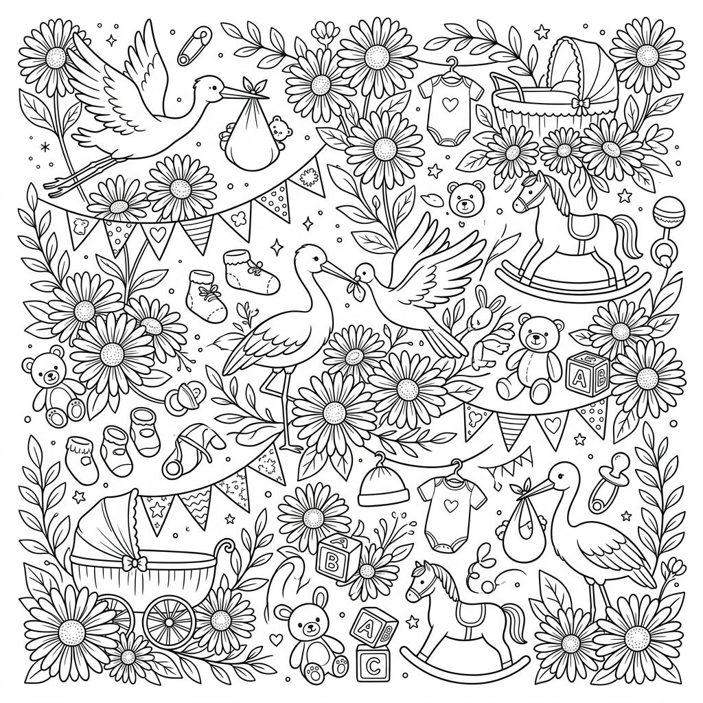 Dive into a world of blossoming joy with this beautifully intricate coloring page, where cheerful daisies intertwine seamlessly with heartwarming baby shower motifs. This detailed design features graceful storks carrying precious bundles, classic baby cradles, and an array of sweet nursery items like tiny onesies, booties, pacifiers, and playful rocking horses. Each element is thoughtfully arranged amidst a lush field of daisies, creating a rich tapestry of new beginnings and natural beauty, ready for your artistic touch.