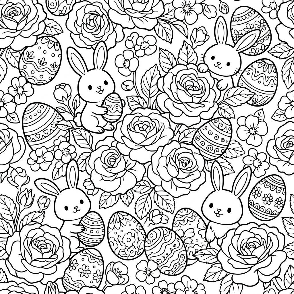 Dive into a blooming wonderland with this intricate coloring page, where the timeless beauty of Damask roses takes center stage. Each rose, with its characteristic loose, semi-double petals, is surrounded by delicate spring blossoms and lush foliage, creating a rich floral tapestry. Nestled among these fragrant blooms, several adorable Easter bunnies peek out, some playfully clutching intricately decorated Easter eggs, while others are surrounded by a scattering of beautifully patterned eggs, each a miniature work of art waiting for your colors.