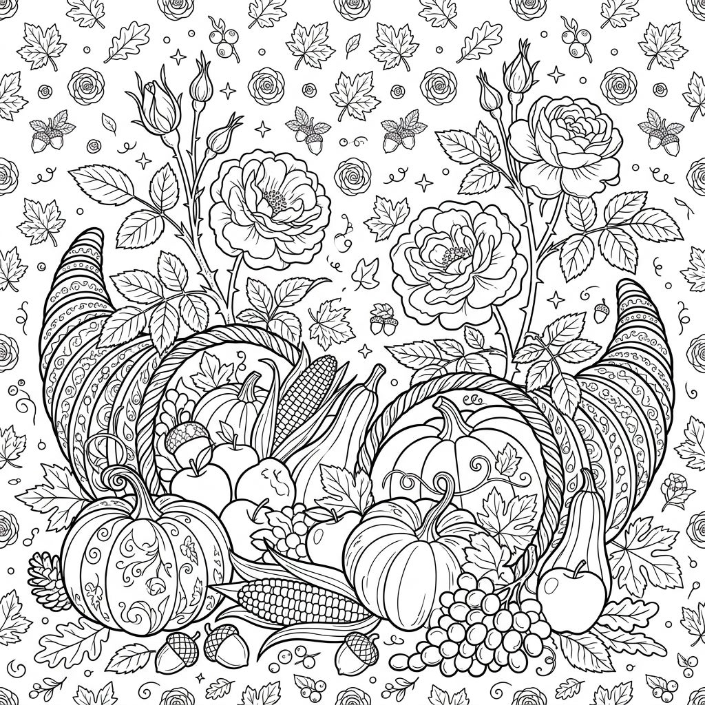 Unleash your creativity on every detail of this captivating page. Experiment with warm fall tones for the pumpkins, corn, and leaves, and perhaps soft pinks, reds, or even purples for the Damask roses to bring them to life. The detailed background pattern of leaves, acorns, and berries offers opportunities for subtle shading or vibrant pops of color. This coloring page isn't just an activity; it's an artistic journey that promotes relaxation, mindfulness, and a deeper connection to the festive spirit of Thanksgiving.