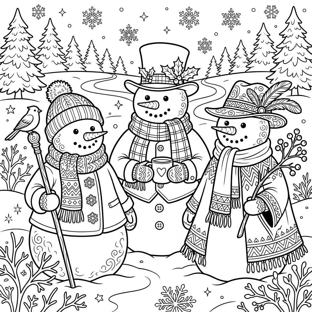 Step into a magical winter scene featuring three charming decorated snowmen, each with their own unique style. The snowman on the left is adorned with a cozy bobble hat, a patterned scarf, and a warm coat, holding a staff topped with a friendly bird. In the center, a dapper snowman sports a top hat decorated with festive holly and berries, a classic plaid scarf, and holds a warm mug, perhaps filled with hot cocoa. To the right, another snowman boasts a stylish feathered hat, an intricately patterned scarf, and a distinctive poncho, holding a branch of winter berries.
