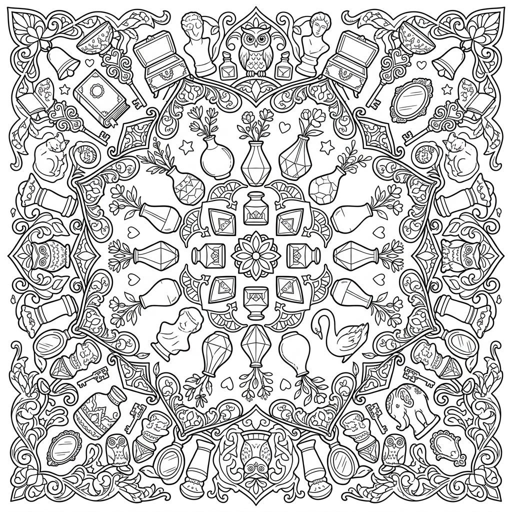 Unveil a mesmerizing world of intricate details with this Decorative Accents Mandala coloring page. This stunning circular design is overflowing with an eclectic collection of charming objects, symmetrically arranged to create a captivating visual feast. Discover elegant vases, ancient-looking keys, delicate bells, ornate mirrors, and miniature statues of owls, cats, swans, and elephants, all intertwined with elaborate swirling patterns and flourishes. Each segment of the mandala is a treasure trove of unique decorative elements, waiting to be brought to life with your favorite colors.