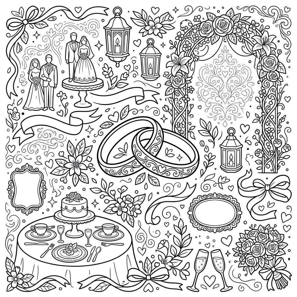 Dive into the romantic world of weddings with this exquisitely detailed coloring page, featuring a beautiful array of decorative accents. Perfect for capturing the joy and elegance of a special day through your artistic touch.