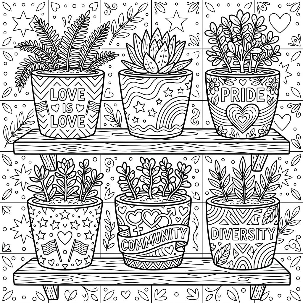 Dive into a vibrant celebration of love and diversity with our special Pride-themed decorative cachepots coloring page. This intricate design showcases six charming potted plants, each nestled in a uniquely adorned cachepot. Discover heartfelt messages like 'LOVE IS LOVE', 'PRIDE', 'COMMUNITY', and 'DIVERSITY', alongside iconic symbols such as rainbows, stars, hearts, and tiny flags. The plants rest on rustic wooden shelves, all set against a delightful background filled with subtle patterns of leaves, stars, and swirls, providing ample creative opportunities.