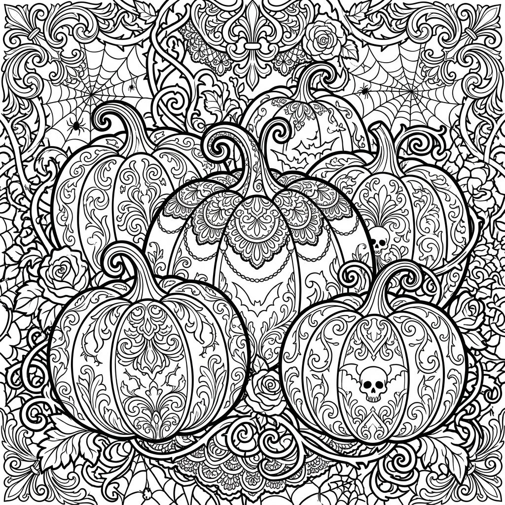 Unleash your creativity with this stunning coloring page featuring decorative pumpkins adorned in a rich Gothic style. Explore intricate patterns, delicate roses, and eerie spiderwebs, perfect for a relaxing and captivating art session.