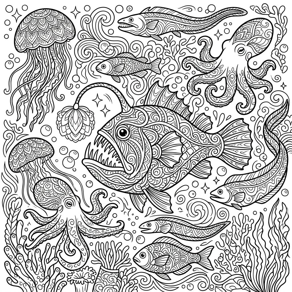 Journey into the mysterious abyss with this captivating adult coloring page, meticulously designed to transport you to the ocean's deepest realms. This intricate illustration is brimming with a diverse array of fascinating deep-sea creatures, including a formidable anglerfish with its unique lure, graceful jellyfish, a clever octopus, sleek eels, and various patterned fish. Each organism is rendered with exquisite, mandala-like details and textures, inviting you to lose yourself in the complexity of the underwater world.