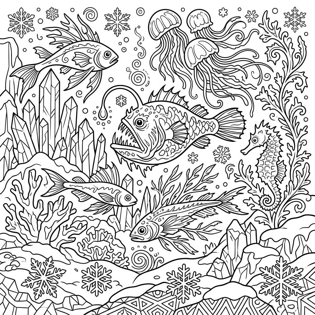Immerse yourself in this richly detailed coloring page, where an array of fascinating deep-sea creatures inhabit a frosty underwater landscape. Discover the formidable anglerfish with its glowing lure, elegant jellyfish trailing their tentacles, graceful smaller fish, and a charming seahorse nestled among the intricate marine flora. The scene is beautifully adorned with sharp ice crystal formations and delicate snowflakes, creating a truly unique and visually stimulating composition.