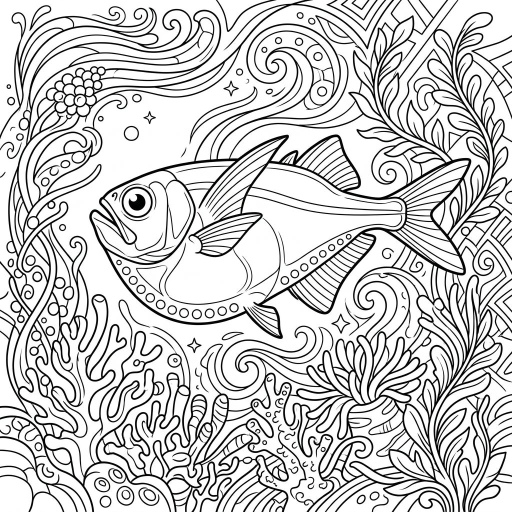 Journey into the mysterious depths with this exquisitely detailed Deep-Sea Hatchetfish coloring page. This unique creature, known for its small, silvery body and compressed shape, is depicted with its signature upward-pointing eyes and a distinctive row of bioluminescent organs along its belly. It swims gracefully through an elaborate underwater tapestry, surrounded by a rich variety of abstract coral formations, elegant marine flora, and dynamic swirling water patterns, all rendered with bold, clean lines perfect for artistic expression.