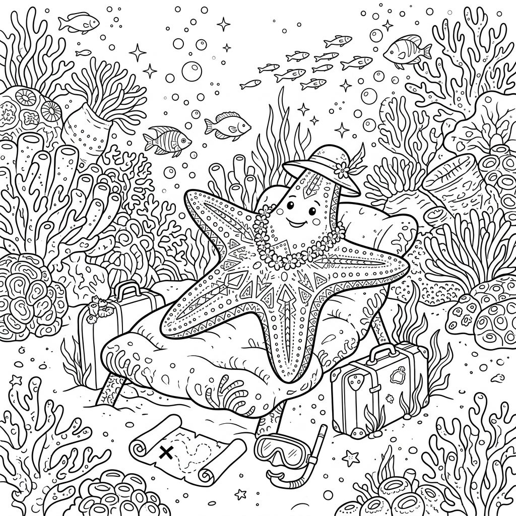 Discover a delightful deep-sea starfish on its dream vacation, lounging amidst coral reefs with suitcases and a snorkel. This enchanting coloring page invites you to bring an underwater holiday to life with your vibrant imagination.