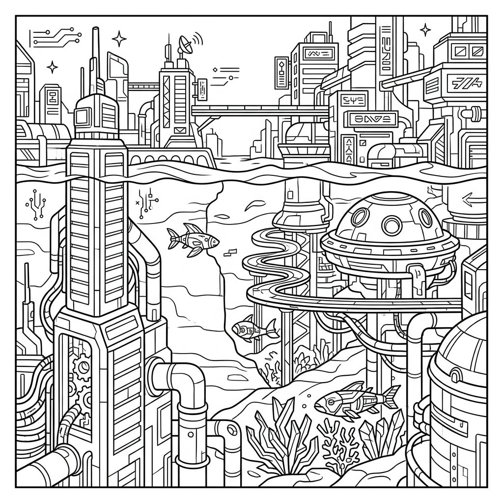 Unleash your creativity on this intricate design! Consider using electric blues, vibrant purples, and glowing greens to highlight the 'neon-like' structures and give them a true cyberpunk luminescence, even in monochrome. Experiment with metallic shades for the buildings and pipes, and perhaps use darker tones for the deep water to create contrast. Add personal touches to the robotic fish and underwater plants, making this futuristic deepwater world uniquely yours. Perfect for colorists looking for an engaging challenge and a journey into a vibrant sci-fi realm.