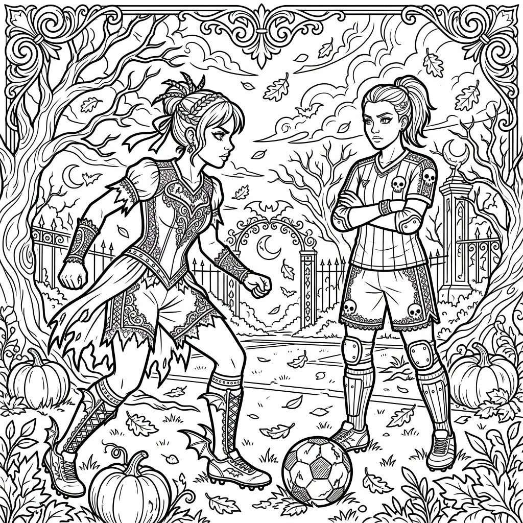 Step into a realm where the thrill of soccer intertwines with the captivating beauty of gothic autumn. This intricate coloring page showcases two formidable female soccer defenders, each exuding strength and style. Observe the player on the left in her dramatic, flowing gothic uniform adorned with exquisite lace patterns and bat-wing accents on her boots, poised for a dynamic move. Across from her stands another powerful defender, her striped jersey featuring edgy skull motifs, arms crossed in confident readiness as a soccer ball rests at her feet.