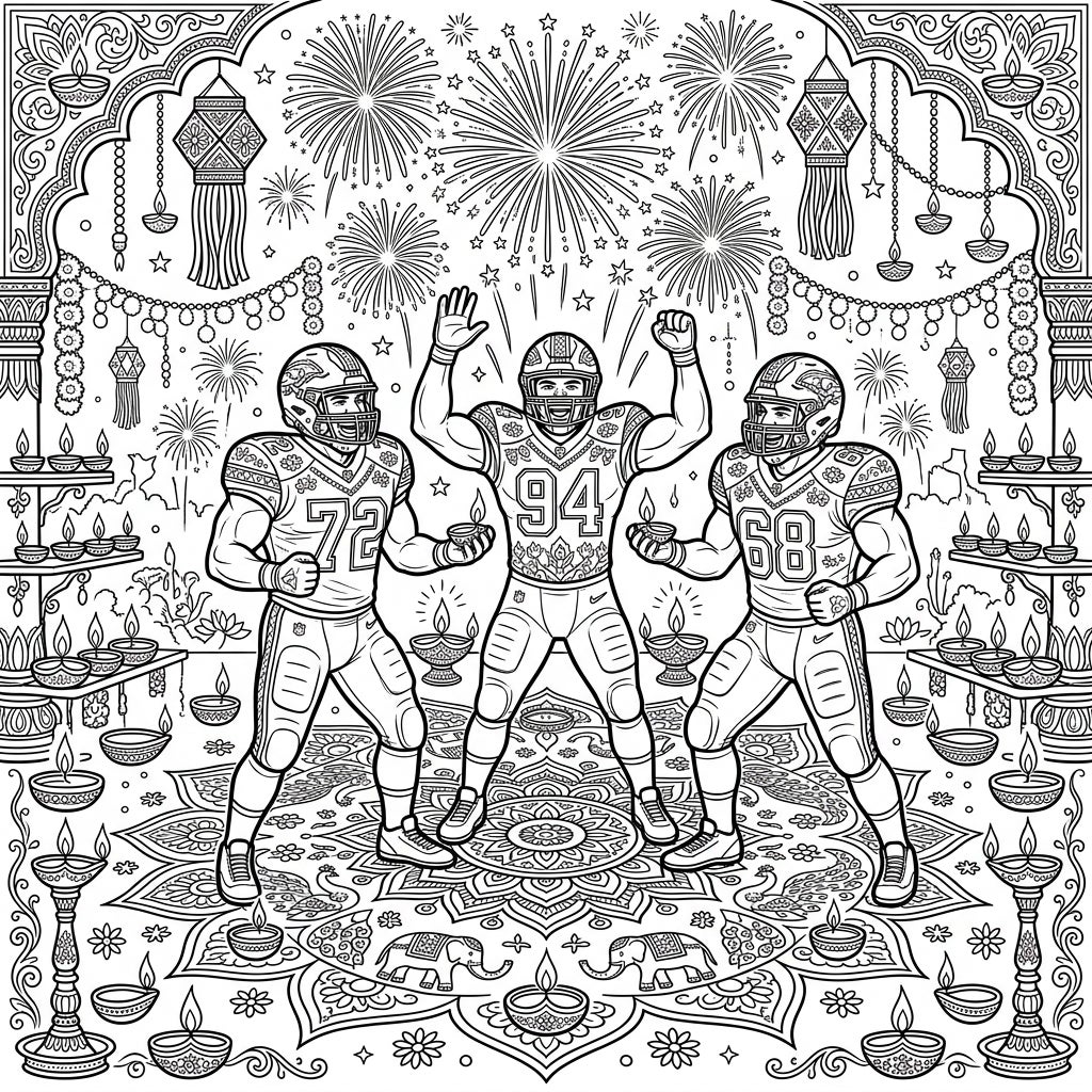 Dive into a truly unique coloring experience where the thrill of American football meets the radiant joy of Diwali. This intricate full-page illustration showcases three robust defensive linemen, decked out in their full gear with numbers 72, 94, and 68 proudly displayed, caught in a moment of festive celebration. They stand amidst a mesmerizing array of traditional Diwali elements, including symmetrical rangoli designs adorning the ground, countless flickering diyas casting a warm glow, elegant hanging lanterns, and spectacular fireworks bursting in the night sky. Look closely, and you'll even spot delicate elephant and peacock motifs woven into the elaborate patterns, adding layers of cultural richness to this dynamic scene.