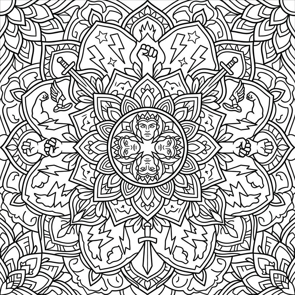 Embark on a mythical coloring adventure with this captivating Demigod Mandala. At its heart, four majestic demigod faces gaze outward, forming the central motif of a perfectly symmetrical radial design. Surrounding them are layers of powerful imagery: raised fists symbolizing strength and determination, lightning bolts representing divine power, stars of heroism, and formidable swords, all interwoven into a complex yet harmonious pattern. Every detail invites you to explore the legends of ancient heroes and gods through the meditative art of coloring.