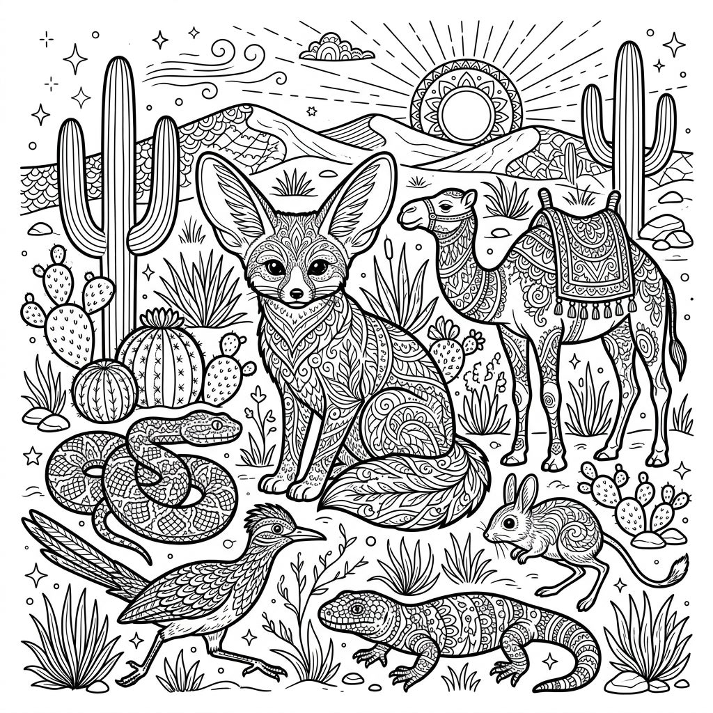 Embark on a creative expedition through the arid landscapes with our exquisite Zentangle Desert Animals coloring page. This intricate design brings together a captivating collection of desert dwellers, each transformed into a canvas of complex patterns. At the heart of the illustration sits a charming fennec fox with its distinctive large ears, alongside a majestic camel adorned with detailed saddlery. Surrounding them are a coiled snake, a swift roadrunner, a textured lizard, and a tiny jerboa, all waiting for your vibrant interpretation.
