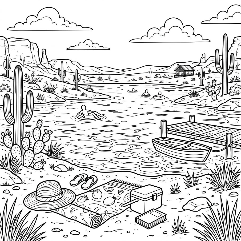 Escape to a serene desert oasis with this captivating coloring page, capturing a vibrant summer day at a tranquil lake. Immerse yourself in the joy of coloring lush cacti, shimmering waters, and relaxing lakeside activities.