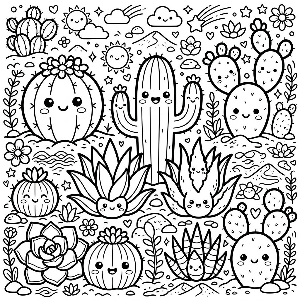 Immerse yourself in the joyful tranquility of this desert oasis, where every plant exudes warmth and happiness. This page is perfect for anyone looking to unwind and express their creativity, offering a peaceful escape into a whimsical landscape. Whether you're a seasoned colorist or just starting, the cheerful expressions and playful composition are sure to brighten your day and inspire a sense of calm and wonder. It's a celebration of nature's beauty, infused with an extra dose of adorable charm.