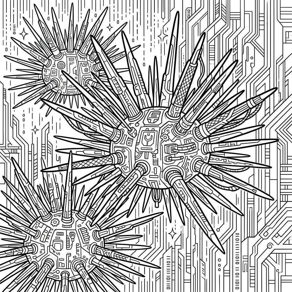 Immerse yourself in a fascinating blend of nature and technology with our exclusive Cyberpunk Diadema Urchins coloring template. This intricate design features three prominent Diadema urchin figures, their traditional spiky forms transformed into stunning examples of futuristic engineering. Each spine and body segment is adorned with detailed circuitry, wires, and subtle robotic components, inviting you to explore a world where marine life meets high-tech innovation. The complex background, filled with circuit board patterns, digital rain motifs, and geometric lines, further enhances this unique dystopian aesthetic.