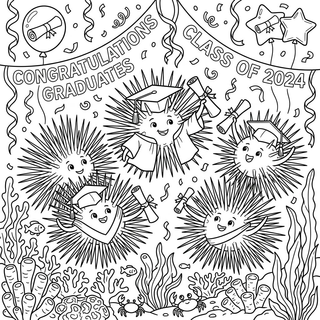 Unleash your creativity by choosing a dazzling array of colors for the urchins' spines – perhaps vibrant purples, blues, or even rainbow hues! Experiment with shading to make the underwater plants truly pop, and use bright, cheerful colors for the graduation attire and diplomas. This page offers ample opportunity to practice different textures and bring depth to each delightful detail, making it a perfect project for colorists of all ages.