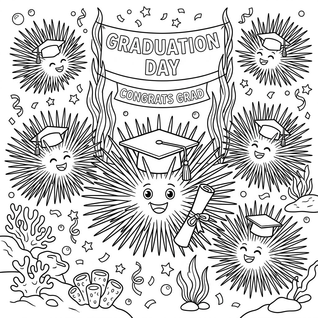 Unleash your creativity and bring this underwater graduation party to life with your favorite colors! Consider using a spectrum of blues and greens for the ocean and sea plants, vibrant yellows and golds for the confetti and stars, and classic black or a bold school color for the graduation caps and diplomas. Experiment with different shades for the urchins' bodies and spines to give them depth and texture. This page offers a wonderful opportunity to explore color blending and shading, making it a truly engaging project for colorists of all ages.