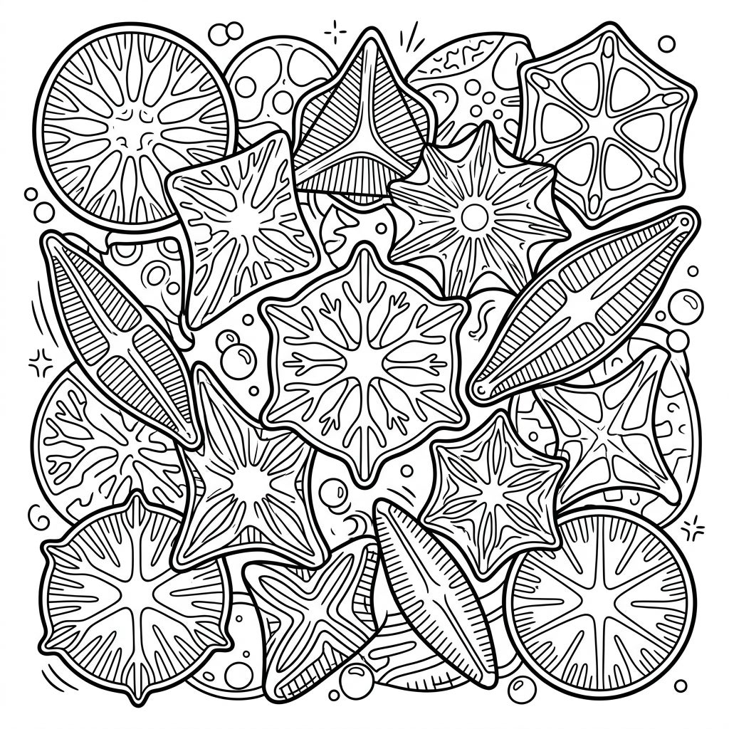 Discover the fascinating world of diatoms reimagined in an exciting Pop Art style! This unique coloring page features a vibrant array of single-celled diatoms, each with its own intricate and symmetrical patterns. From circular and star-like forms to elegant boat shapes, every diatom is presented with the bold, graphic outlines characteristic of Pop Art, making their delicate structures stand out beautifully.