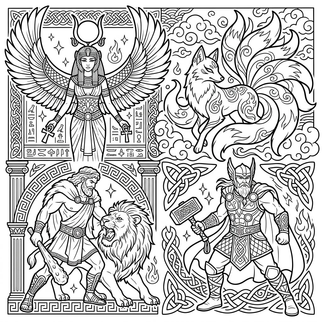 Unleash your creativity with this epic coloring page, a true pantheon of mythological might! This intricate design is divided into four captivating sections, each dedicated to a legendary figure. In the upper left, an Egyptian goddess, reminiscent of the powerful Isis, stands with majestic wings and ankhs, surrounded by ancient hieroglyphs. The upper right panel transports you to Japanese folklore with a mystical nine-tailed Kitsune, gracefully poised amidst swirling clouds. Below, the legendary strength of Hercules, or a similar hero, is captured in his fierce struggle with a lion, framed by classic Greek geometric patterns. Finally, the bottom right proudly presents the Norse god Thor, Mjolnir in hand, encased within a beautiful Celtic knot design.