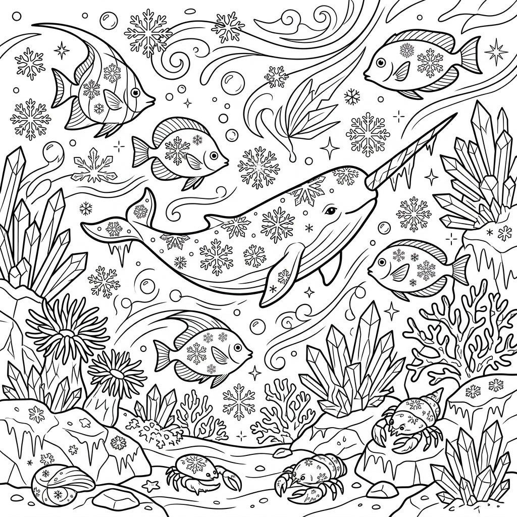 Explore a magical underwater world where marine life meets winter enchantment. This intricate coloring page features a majestic narwhal, snowflake-patterned fish, and frosty corals, perfect for a cozy creative session.