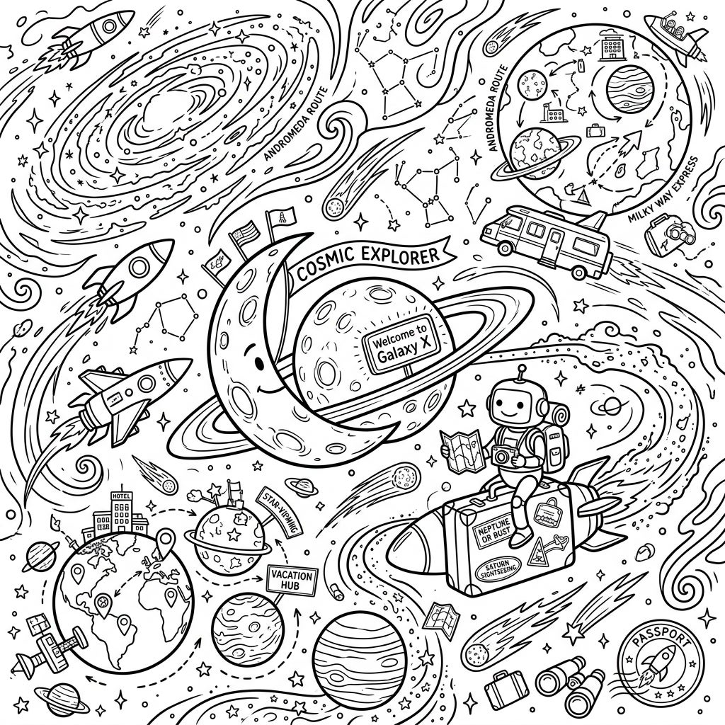 This coloring page beautifully captures the exhilarating mood of a grand interstellar journey, transforming the vastness of space into a playful and exciting vacation destination. Imagine the thrill of visiting distant planets, stargazing from a 'Vacation Hub', or charting new courses with a 'Cosmic Explorer' banner fluttering amongst the stars. It’s an ode to curiosity, adventure, and the boundless joy of discovering new worlds, perfect for anyone who dreams of an epic galactic getaway.