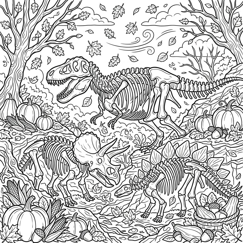Combine the thrill of ancient dinosaurs with the cozy charm of autumn in this unique coloring page. Explore a detailed scene featuring dinosaur skeletons amidst falling leaves, pumpkins, and harvest delights.